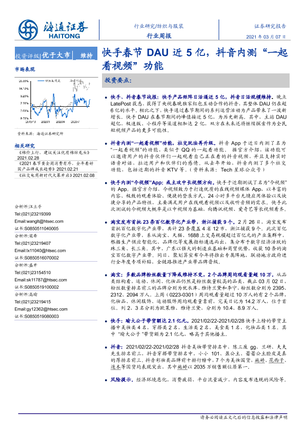 【海通证券】【20210307】20210307-海通证券-纺织与服装行业周报:快手春节DAU近5亿,抖音内测“一起看视频”功能-10页