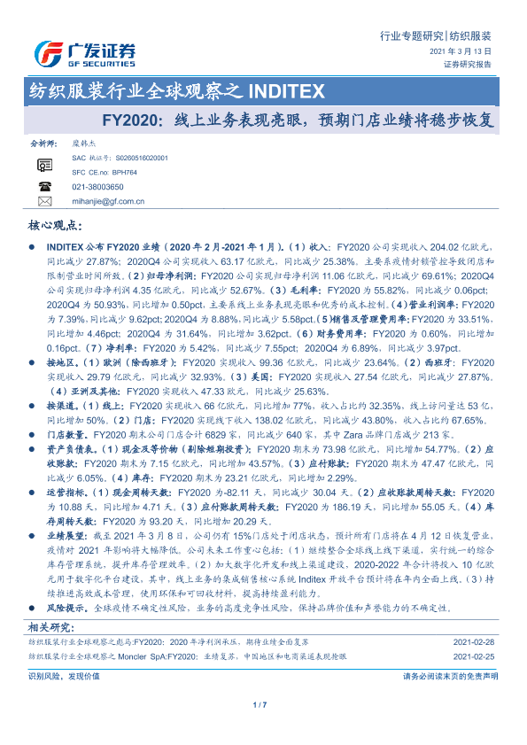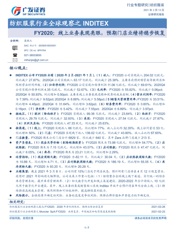 【广发证券】【20210313】纺织服装行业全球观察之 INDITEX-FY2020:线上业务表现亮眼,预期门店业绩将稳步恢复-7页