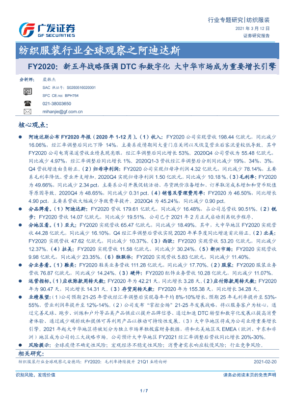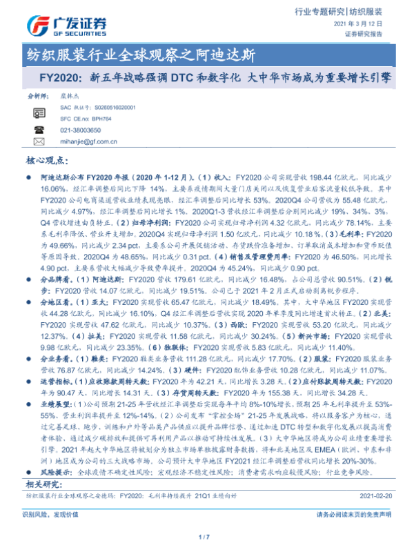 【广发证券】【20210312】纺织服装行业全球观察之阿迪达斯:FY2020:新五年战略强调DTC和数字化 大中华市场成为重要增长引擎-7页