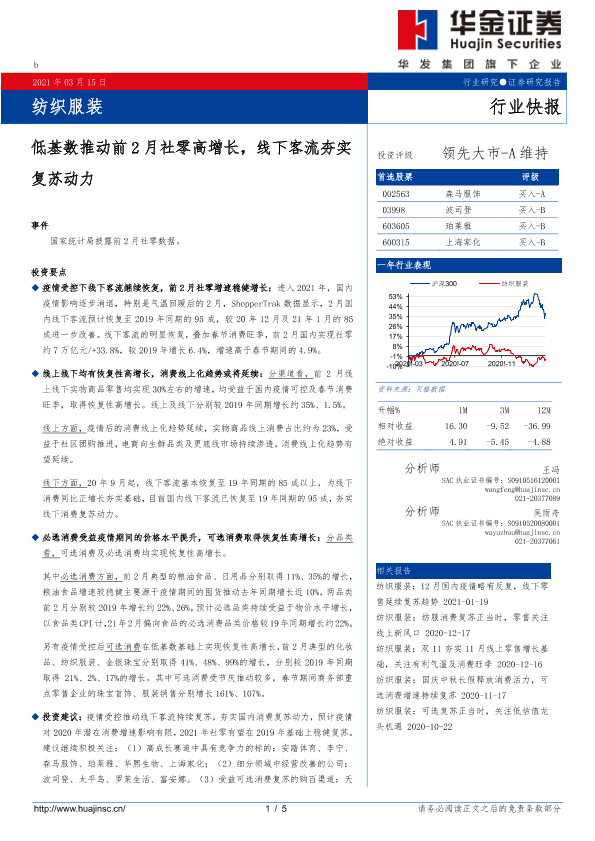 【华金证券】【20210315】纺织服装:低基数推动前2月社零高增长,线下客流夯实复苏动力-5页