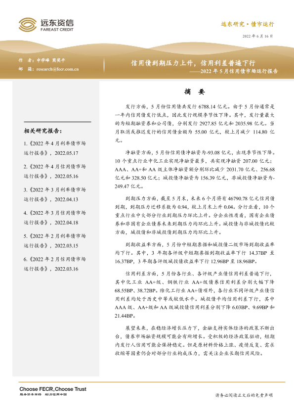 【远东资信】【20220616】2022年5月信用债市场运行报告:信用债到期压力上升,信用利差普遍下行-18页