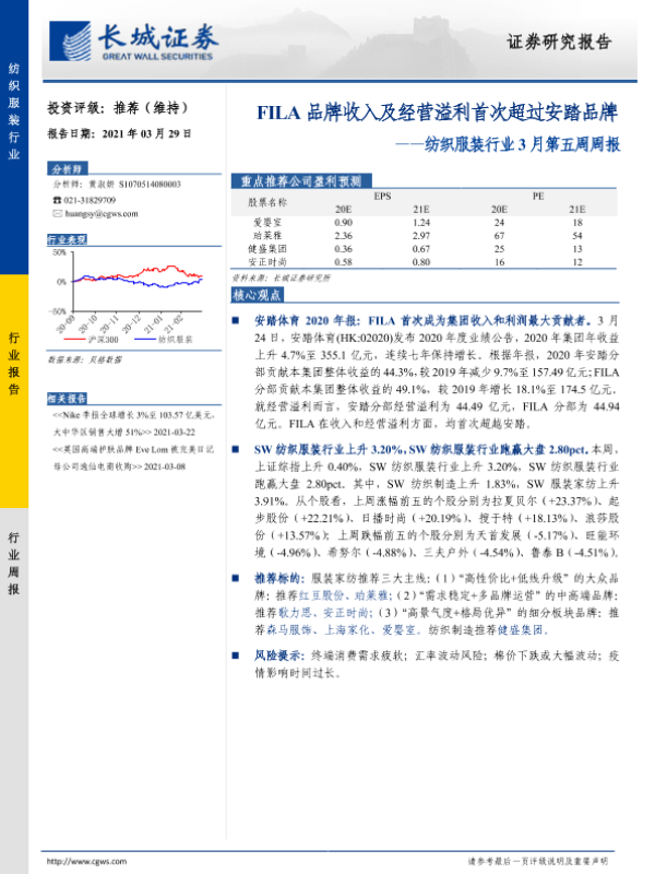 【长城证券】【20210329】20210329-长城证券-纺织服装行业3月第五周周报:FILA品牌收入及经营溢利首次超过安踏品牌-16页