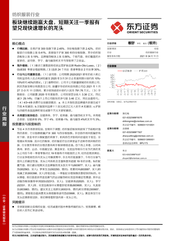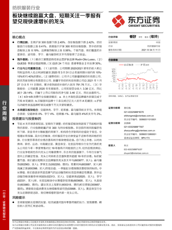 【东方证券】【20210411】20210411-东方证券-纺织服装行业周报:板块继续跑赢大盘,短期关注一季报有望兑现快速增长的龙头-10页