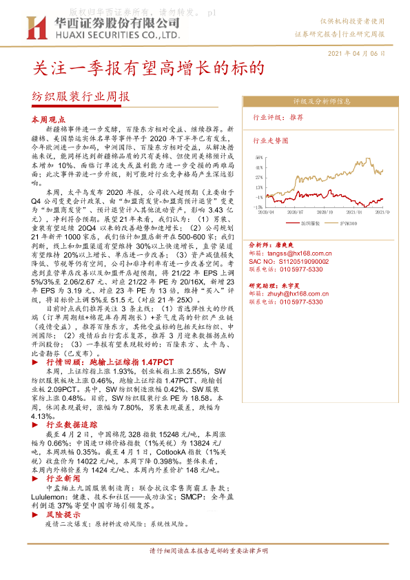 【华西证券】【20210406】纺织服装行业周报:关注一季报有望高增长的标的-13页