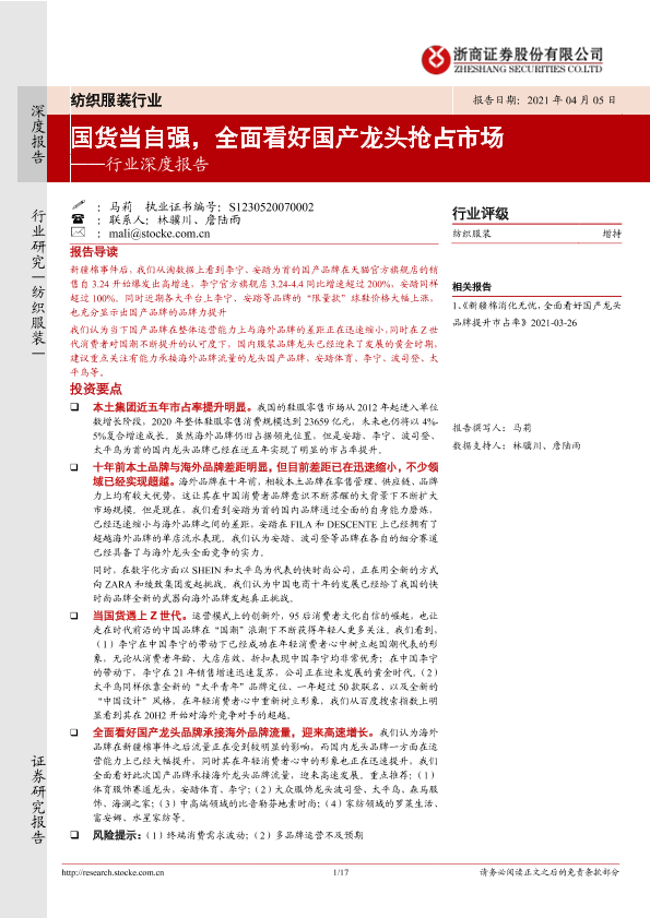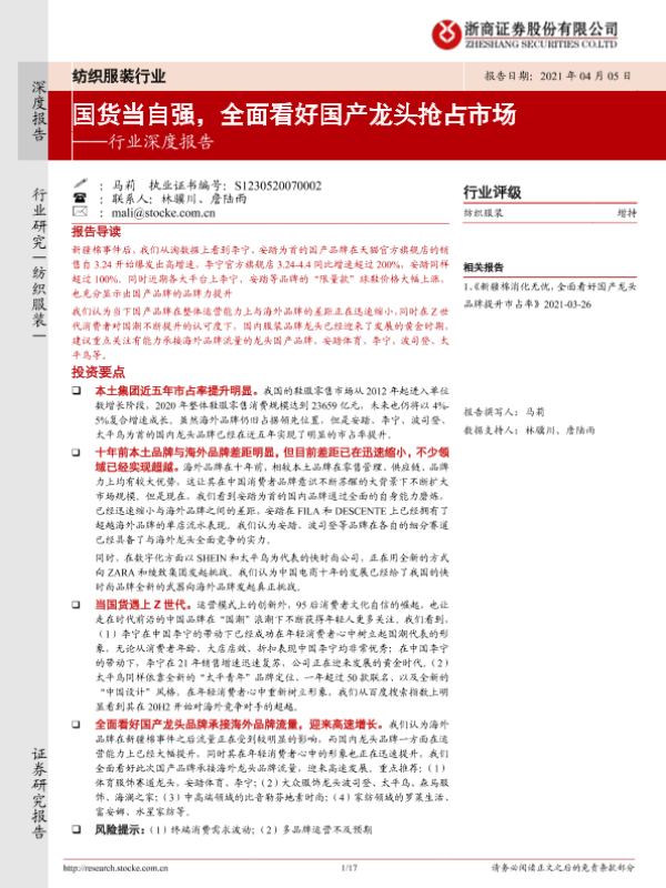【浙商证券】【20210405】20210405-浙商证券-纺织服装行业深度报告:国货当自强,全面看好国产龙头抢占市场-17页