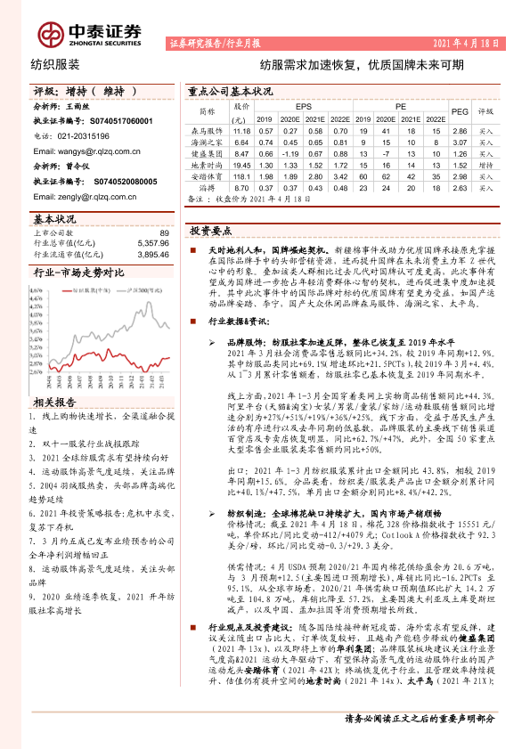 【中泰证券】【20210418】20210418-中泰证券-纺织服装行业月报:纺服需求加速恢复,优质国牌未来可期-23页