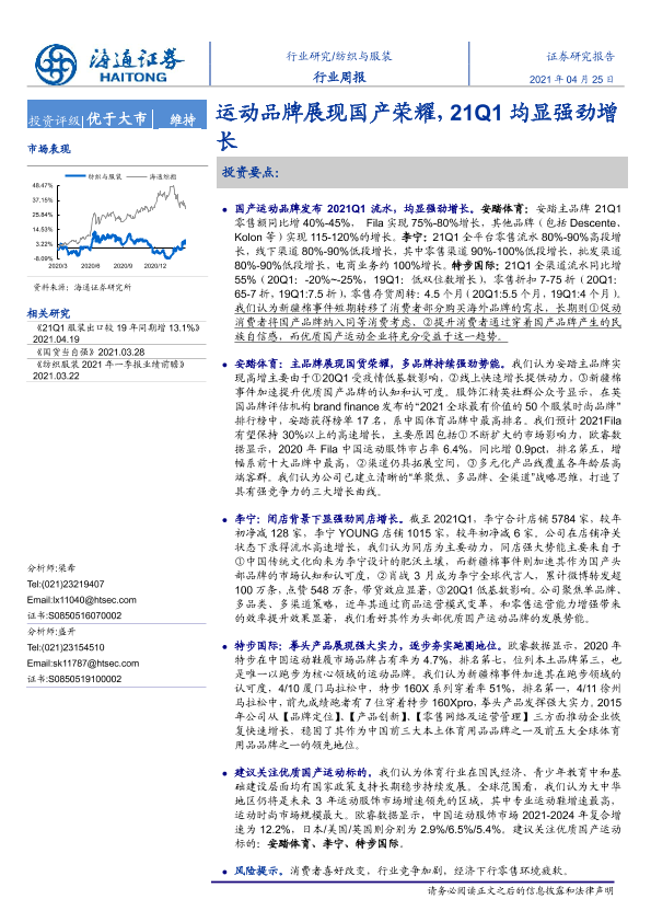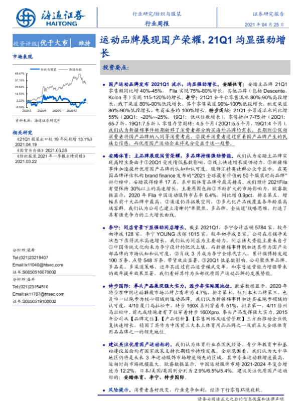 【海通证券】【20210425】纺织与服装行业周报:运动品牌展现国产荣耀,21Q1均显强劲增长-7页