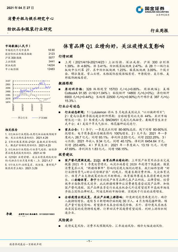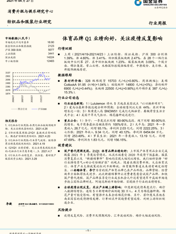 【国金证券】【20210427】20210427-国金证券-纺织品和服装行业研究:体育品牌Q1业绩向好,关注疫情反复影响-16页