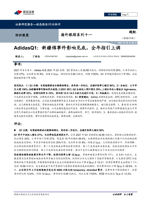 【国信证券】【20210509】纺织服装海外跟踪系列十一:AdidasQ1:新疆棉事件影响见底,全年指引上调-8页