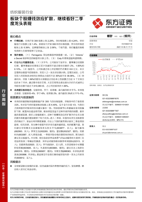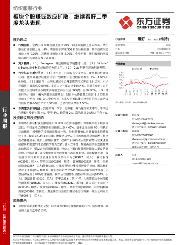 【东方证券】【20210517】纺织服装行业周报:板块个股赚钱效应扩散,继续看好二季度龙头表现-10页