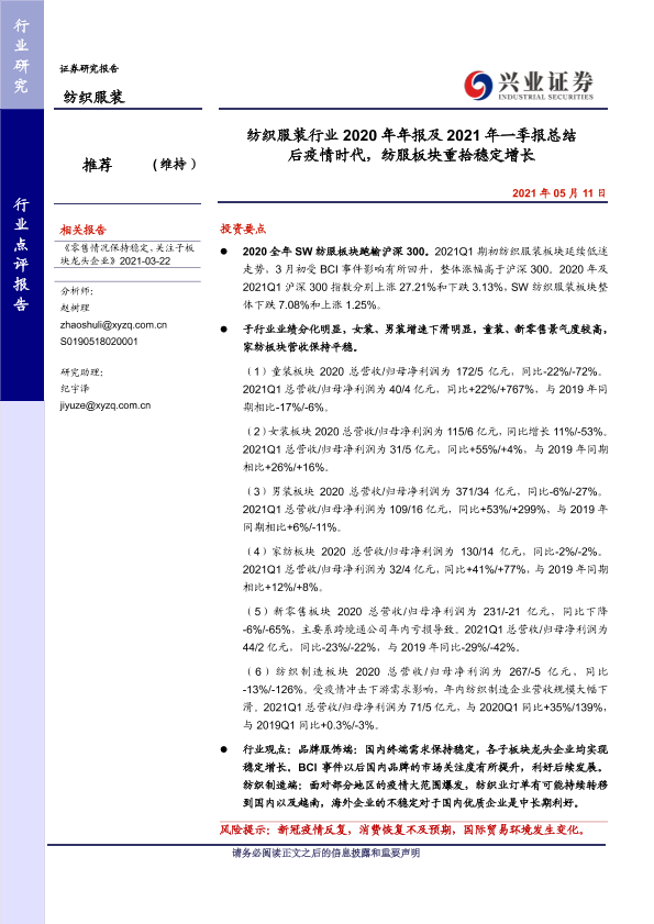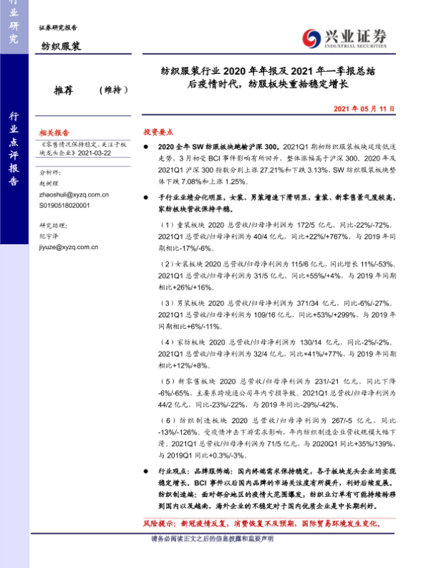 一季度报 后疫情时代 年报总结 稳定增长 纺织服装