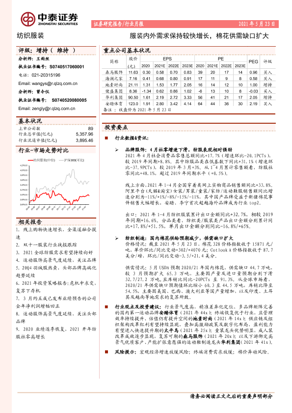 【中泰证券】【20210523】纺织服装行业月报:服装内外需求保持较快增长,棉花供需缺口扩大-15页