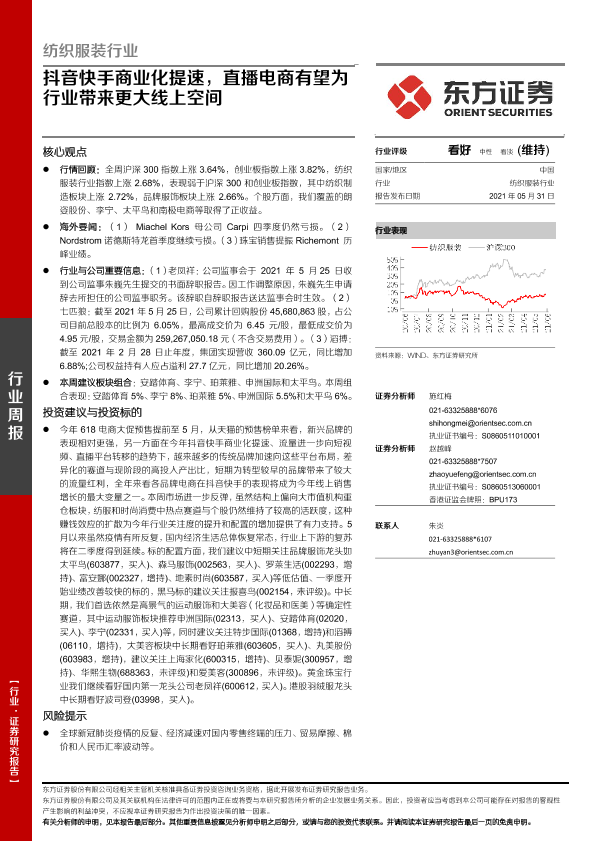 【东方证券】【20210531】20210531-东方证券-纺织服装行业周报:抖音快手商业化提速,直播电商有望为行业带来更大线上空间-9页