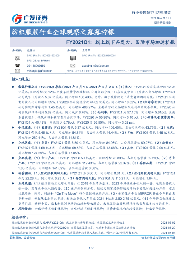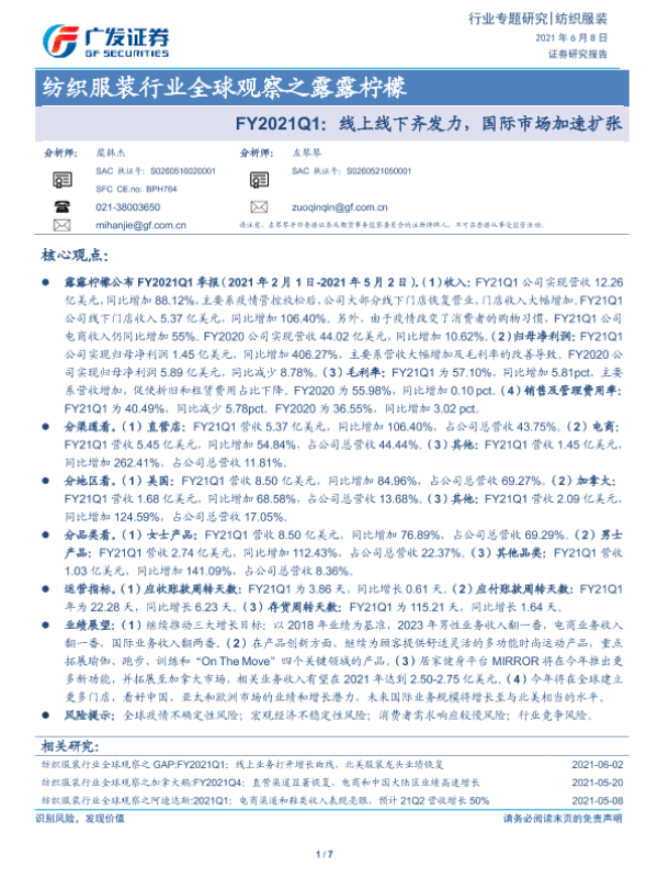 【广发证券】【20210608】纺织服装行业全球观察之露露柠檬:FY2021Q1:线上线下齐发力,国际市场加速扩张-7页