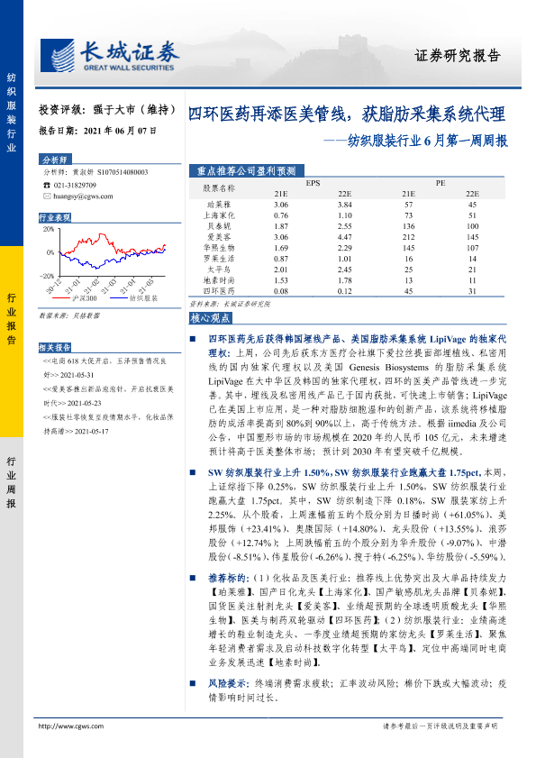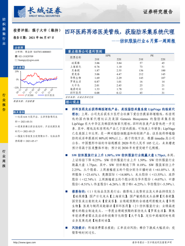 【长城证券】【20210607】20210607-长城证券-纺织服装行业6月第一周周报:四环医药再添医美管线,获脂肪采集系统代理-13页
