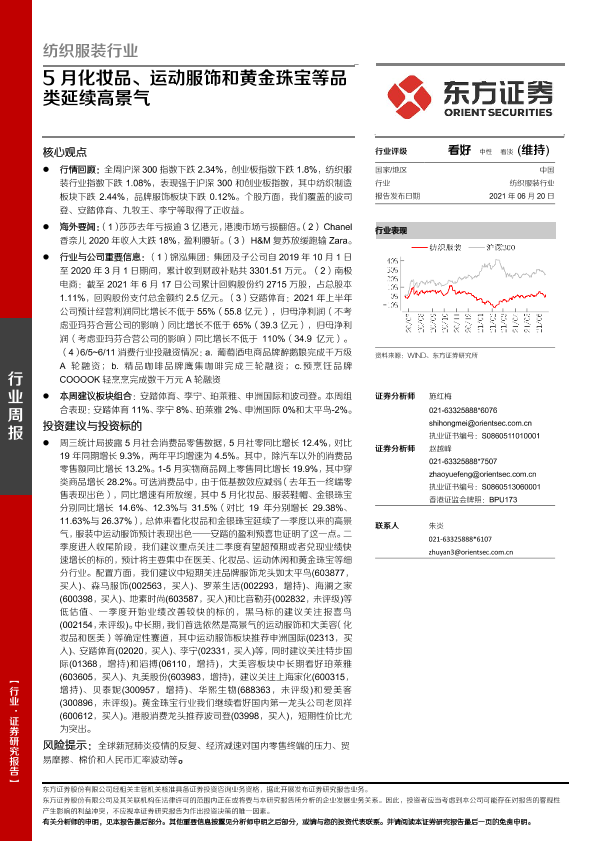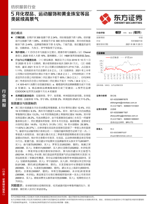 【东方证券】【20210620】20210620-东方证券-纺织服装行业周报:5月化妆品、运动服饰和黄金珠宝等品类延续高景气-10页