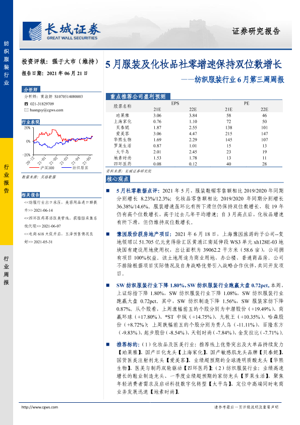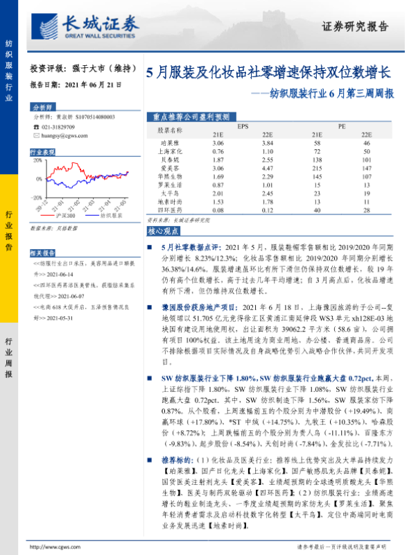 【长城证券】【20210621】20210621-长城证券-纺织服装行业6月第三周周报:5月服装及化妆品社零增速保持双位数增长-14页