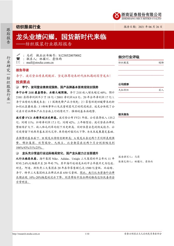 【浙商证券】【20210626】20210626-浙商证券-纺织服装行业跟踪报告:龙头业绩闪耀,国货新时代来临-10页