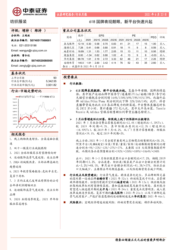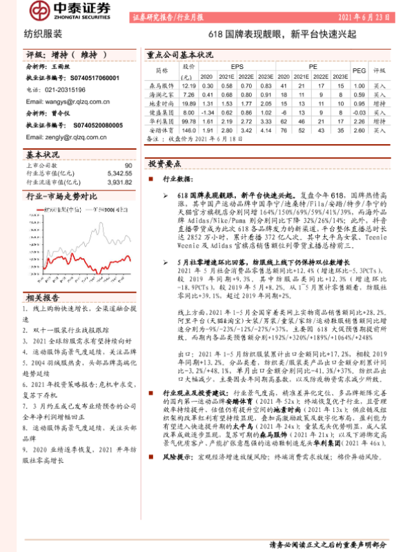 【中泰证券】【20210623】纺织服装行业月报:618国牌表现靓眼,新平台快速兴起-16页