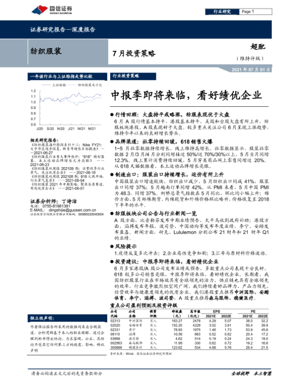 【国信证券】【20210701】20210701-国信证券-纺织服装7月投资策略:中报季即将来临,看好绩优企业-18页