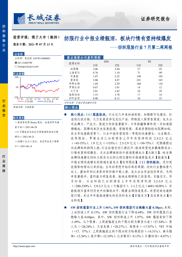 【长城证券】【20210713】20210713-长城证券-纺织服装行业7月第二周周报:纺服行业中报业绩靓丽,板块行情有望持续爆发-14页