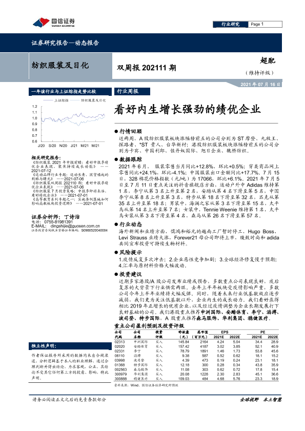 【国信证券】【20210716】纺织服装及日化:看好内生增长强劲的绩优企业-8页