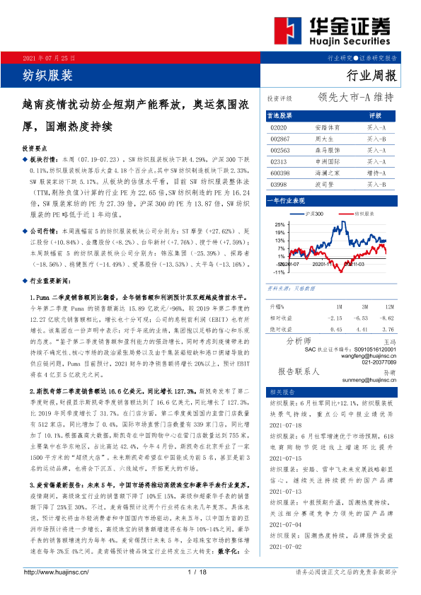 【华金证券】【20210725】20210725-华金证券-纺织服装行业周报:越南疫情扰动纺企短期产能释放,奥运氛围浓厚,国潮热度持续-18页