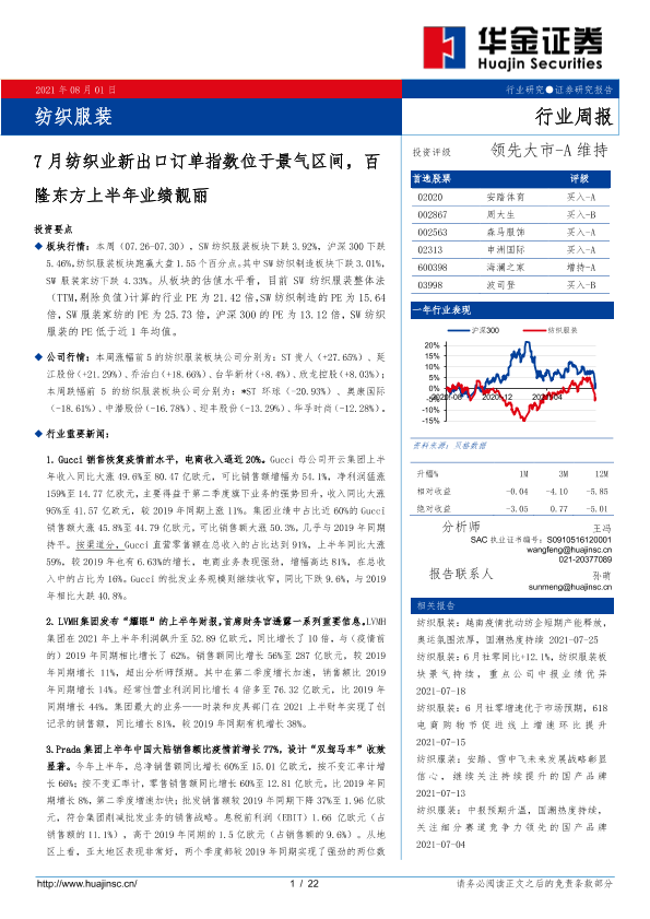 【华金证券】【20210801】20210801-华金证券-纺织服装行业周报:7月纺织业新出口订单指数位于景气区间,百隆东方上半年业绩靓丽-22页