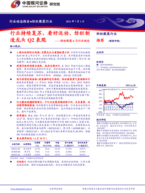 【银河证券】【20210701】20210701-中国银河-纺织服装6月行业动态:行业持续复苏,看好运动、纺织制造龙头Q2表现-24页