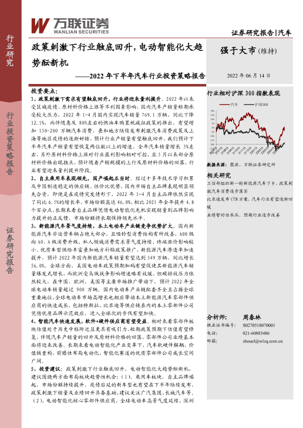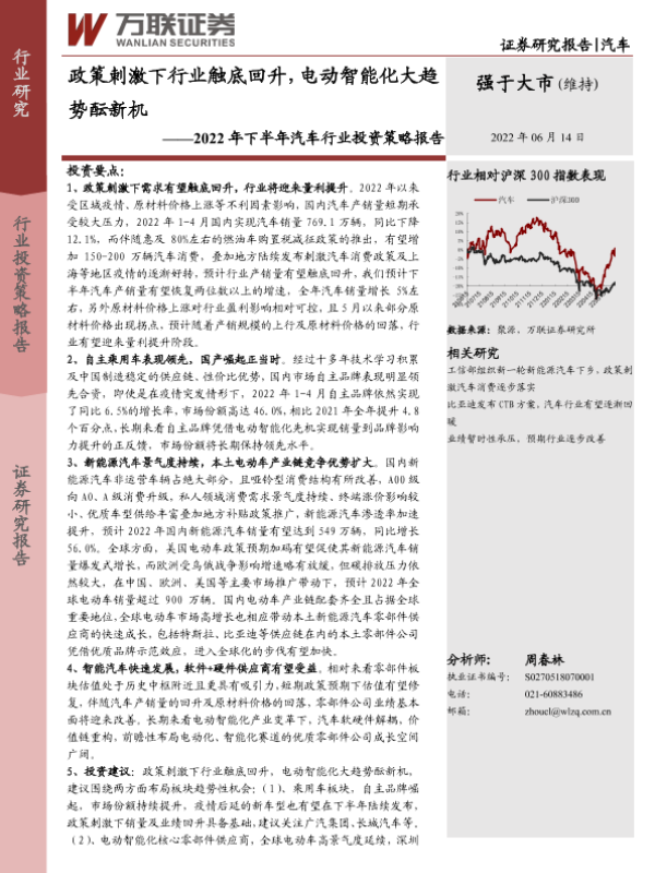 【万联证券】【20220614】2022年下半年汽车行业投资策略报告:政策刺激下行业触底回升,电动智能化大趋势酝新机-27页