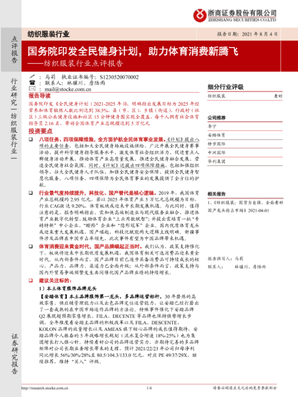 【浙商证券】【20210804】纺织服装行业点评报告:国务院印发全民健身计划,助力体育消费新腾飞-4页