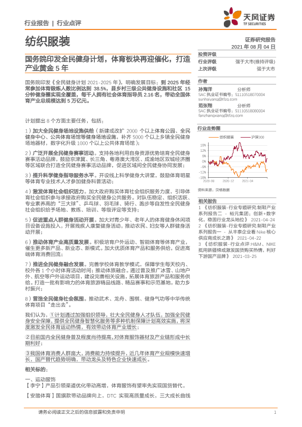【天风证券】【20210804】天风证券-纺织服装:国务院印发全民健身计划,体育板块再迎催化,打造产业黄金5年-3页