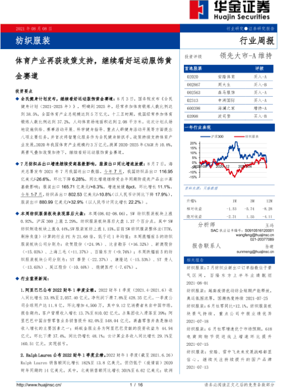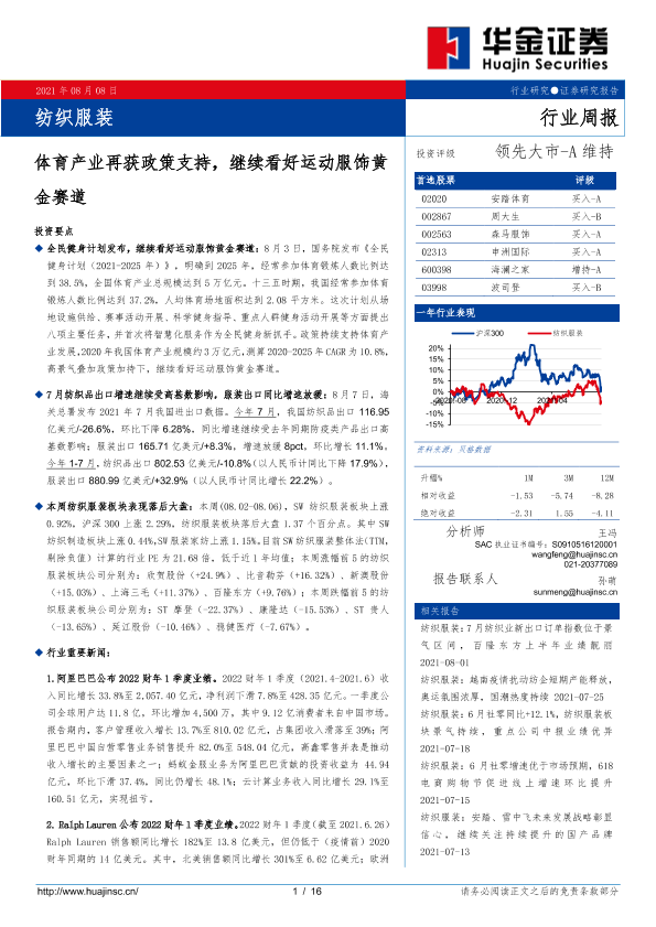 【华金证券】【20210808】纺织服装行业周报:体育产业再获政策支持,继续看好运动服饰黄金赛道-16页