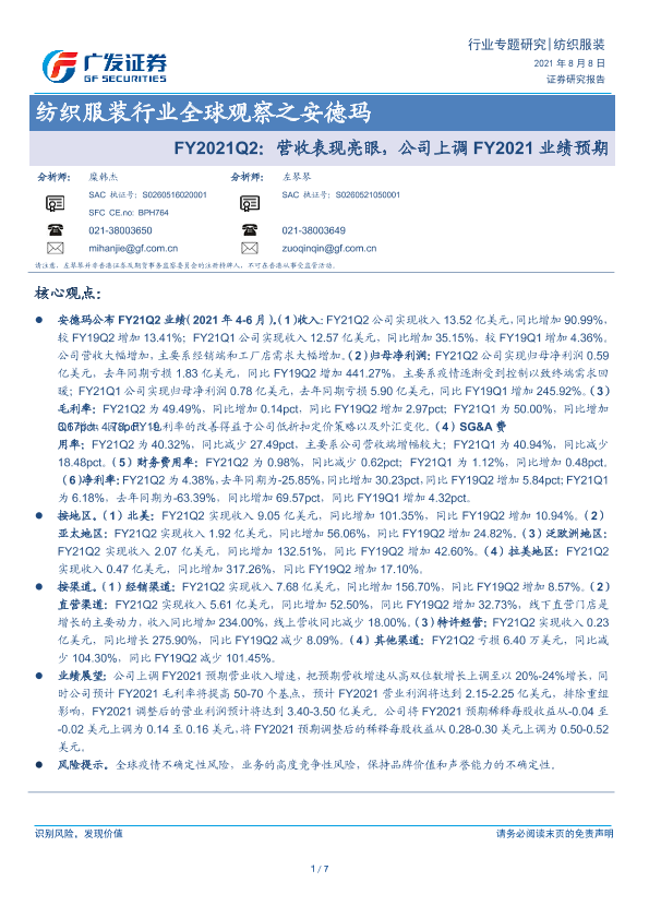 【广发证券】【20210808】纺织服装行业全球观察之安德玛:FY2021Q2:营收表现亮眼,公司上调FY2021业绩预期-7页