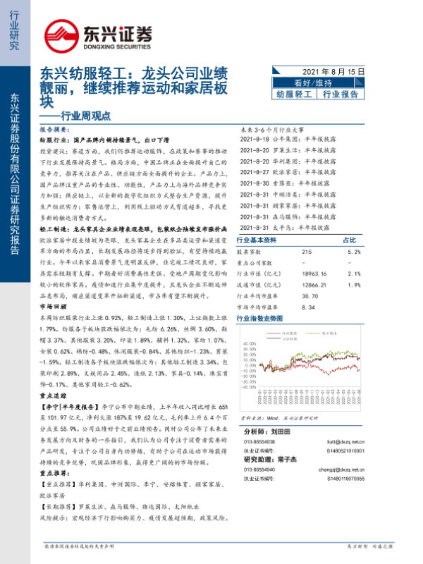 【东兴证券】【20210815】东兴纺服轻工行业周观点:龙头公司业绩靓丽,继续推荐运动和家居板块-11页
