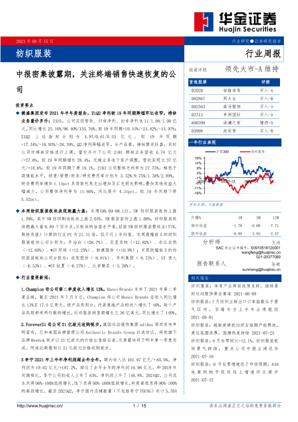 【华金证券】【20210815】20210815-华金证券-纺织服装行业周报:中报密集披露期,关注终端销售快速恢复的公司-15页