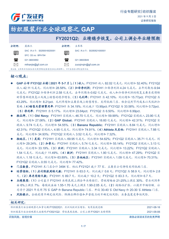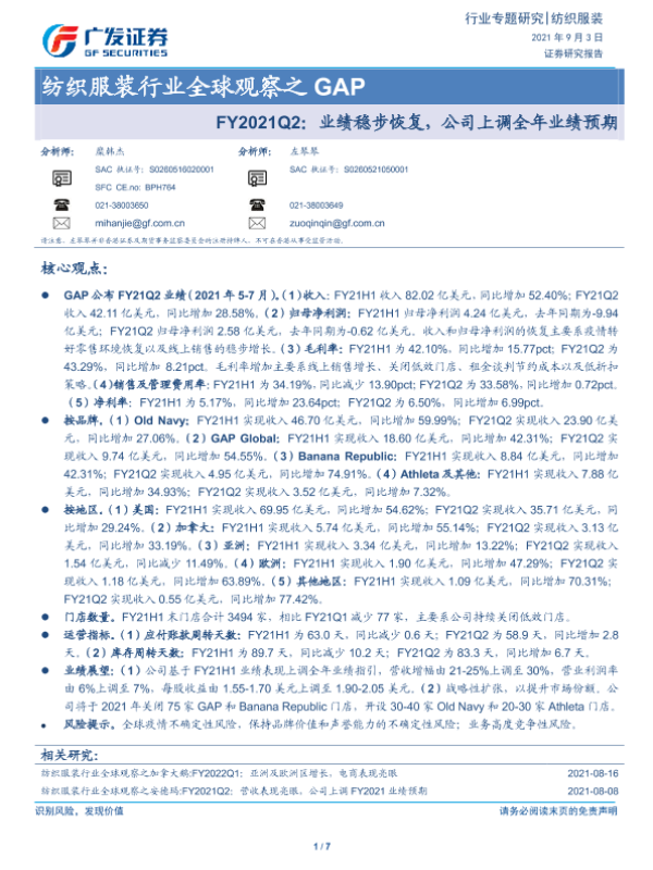 【广发证券】【20210903】纺织服装行业全球观察之GAP:FY2021Q2:业绩稳步恢复,公司上调全年业绩预期-7页