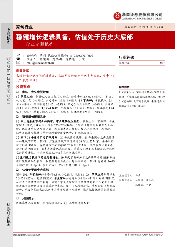 【浙商证券】【20210823】家纺行业专题报告:稳健增长逻辑具备,估值处于历史大底部-8页