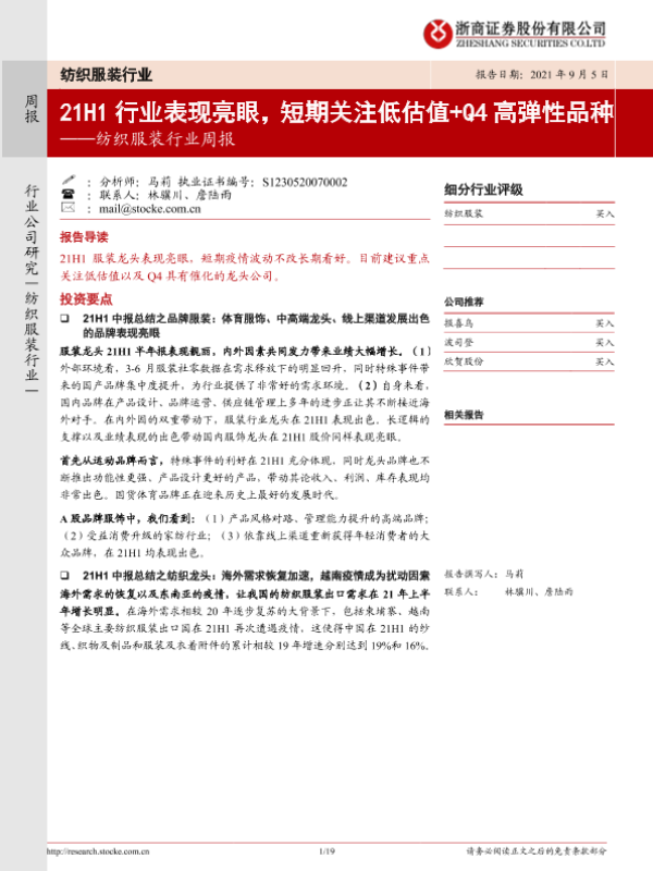 【浙商证券】【20210905】20210905-浙商证券-纺织服装行业周报:21H1行业表现亮眼,短期关注低估值+Q4高弹性品种-19页
