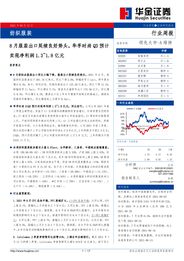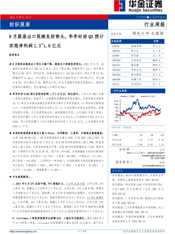 【华金证券】【20210912】20210912-华金证券-纺织服装行业周报:8月服装出口延续良好势头,华孚时尚Q3预计实现净利润1.3-1.8亿元-17页