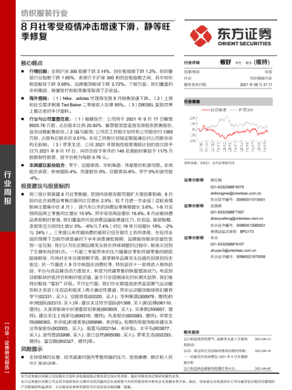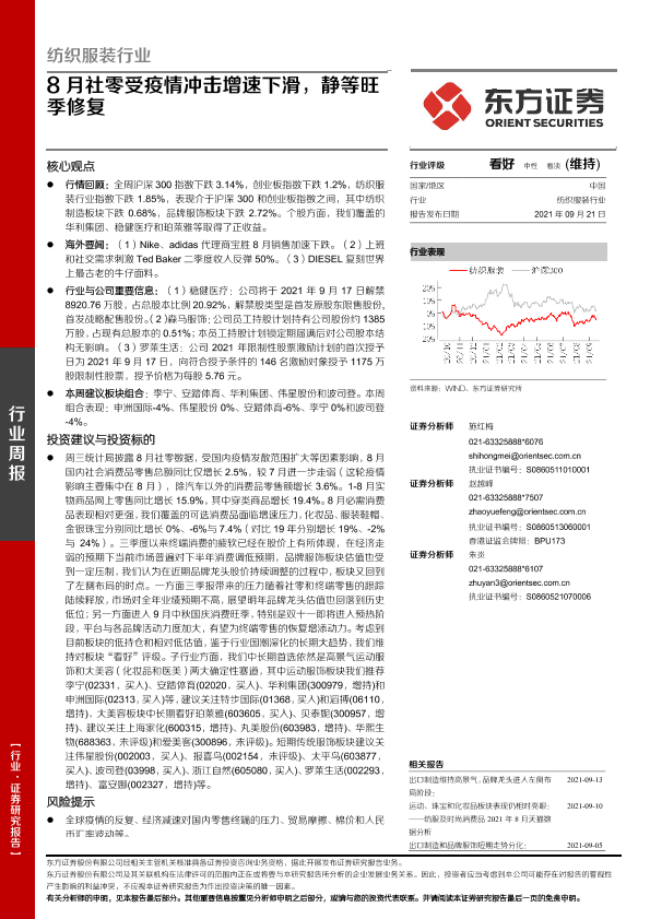 【东方证券】【20210921】纺织服装行业:8月社零受疫情冲击增速下滑,静等旺季修复-9页