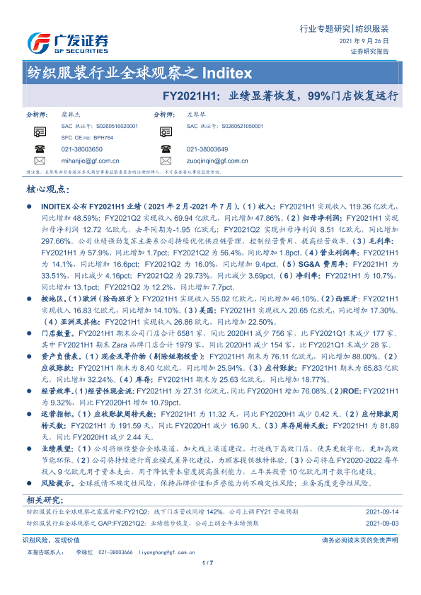 【广发证券】【20210926】纺织服装行业全球观察之Inditex:FY2021H1:业绩显著恢复,99%门店恢复运行-7页