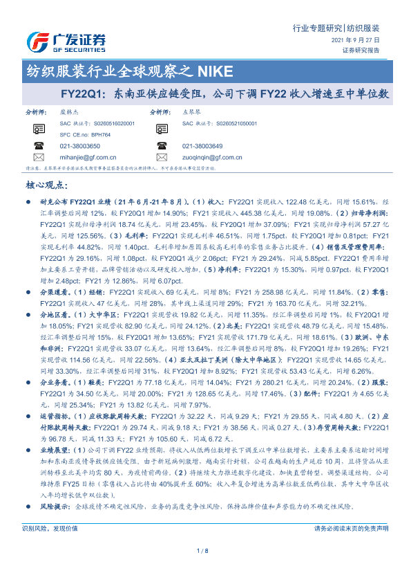 【广发证券】【20210927】纺织服装行业全球观察之 NIKE:FY22Q1:东南亚供应链受阻,公司下调 FY22收入增速至中单位数-8页