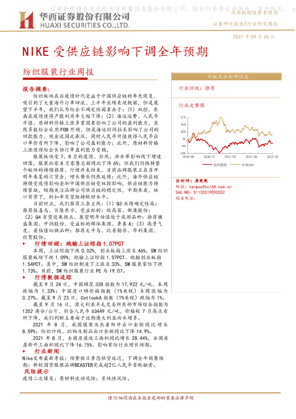 【华西证券】【20210926】纺织服装行业周报:NIKE受供应链影响下调全年预期-22页
