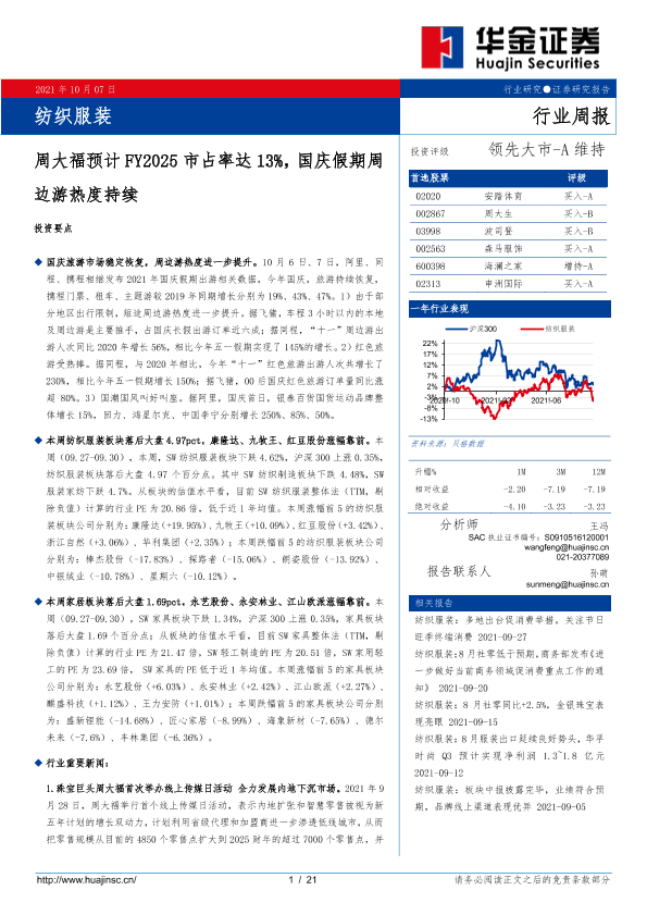 【华金证券】【20211007】20211007-华金证券-纺织服装行业周报:周大福预计FY2025市占率达13%,国庆假期周边游热度持续-21页
