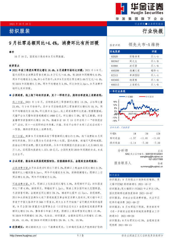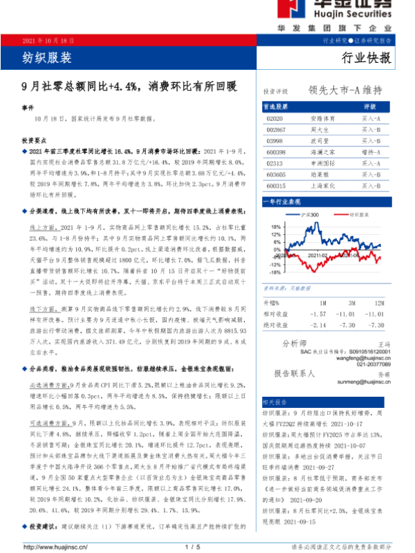 【华金证券】【20211018】纺织服装:9月社零总额同比+4.4%,消费环比有所回暖-5页