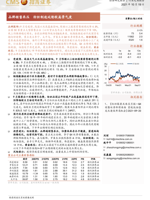 【海通证券】【20211019】纺织服装及珠宝行业:品牌销售承压 纺织制造延续较高景气度-7页