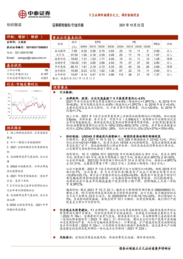 【中泰证券】【20211022】20211022-中泰证券-纺织服装行业月报:9月品牌终端增长乏力,棉价涨幅明显-18页