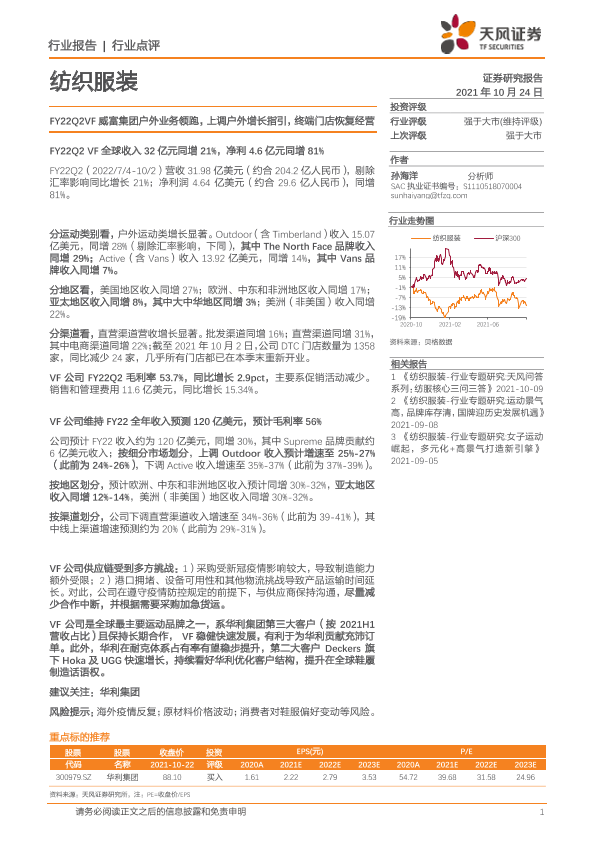 【天风证券】【20211024】纺织服装行业点评:FY22Q2VF威富集团户外业务领跑,上调户外增长指引,终端门店恢复经营-2页
