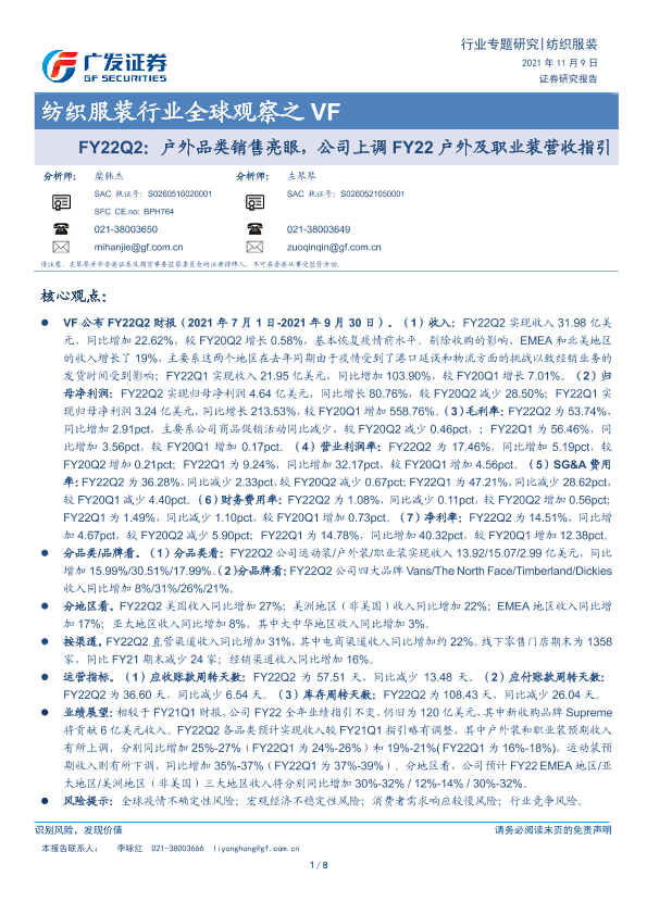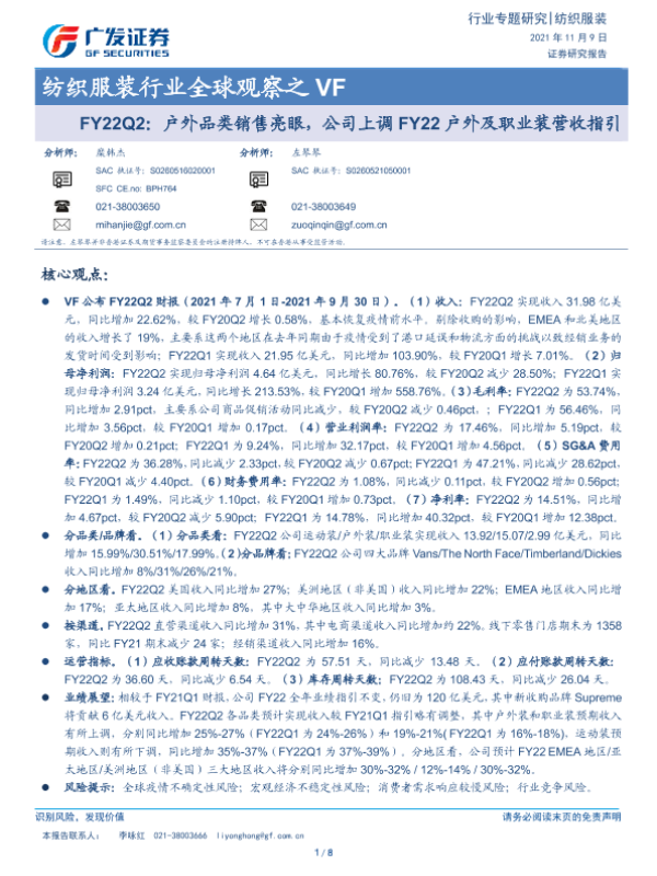 【广发证券】【20211109】纺织服装行业全球观察之 VF:FY22Q2:户外品类销售亮眼,公司上调 FY22户外及职业装营收指引-8页